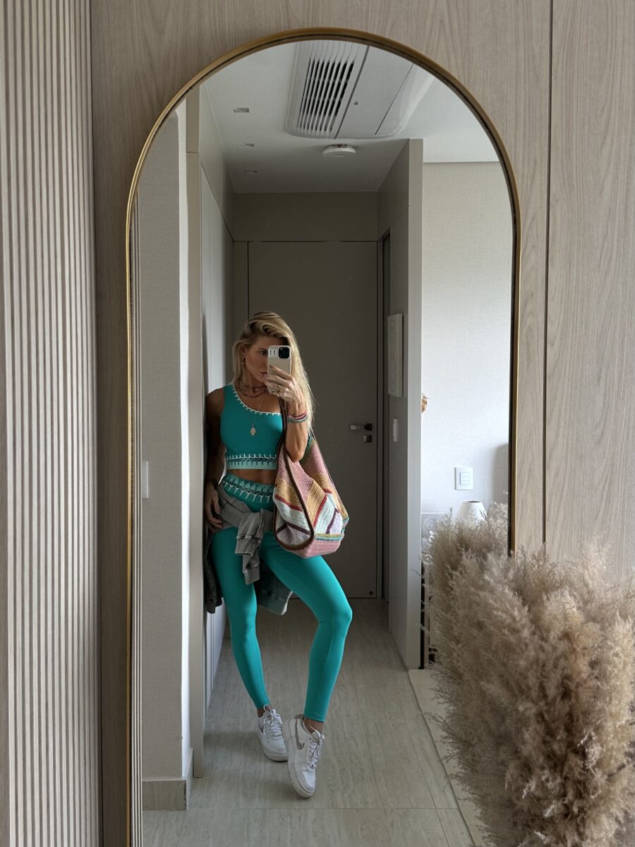 Legging em malha poliamida, modelagem única que se adapta perfeitamente ao corpo, sem costuras laterais, e cós com acabamento diferenciado em crochê, que valoriza o nosso artesanato, incentivando a mão de obra local e o comércio justo.